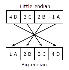 下图说明了 32 位(4 字节)十六进制数 4D3C2B1A 的转换。在十六进制记数法中,一个字节用两个位表示。Little-endian 图中的每个框显示一个字节的数据(4D、3C、2B 和 1A)。swapbytes 函数交换这些框或字节的顺序。
