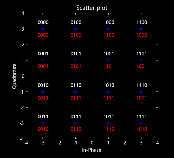 显示编码映射图。调用 qammod 函数,绘制IQ调制的星座图并使用格雷码 y 和二进制 z 对其进行标记。 格雷码以黑色显示,自然二进制码以红色显示。 设置轴缩放比例,以便显示所有点。