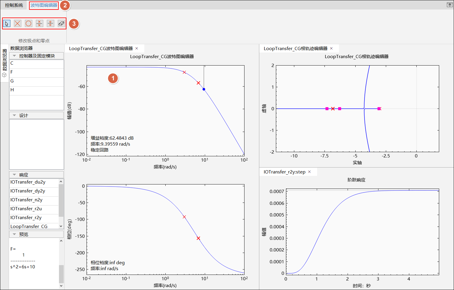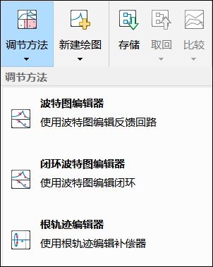 控制系统设计器提供三种图形调节方法,分别为波特图编辑器、闭环波特图编辑器和根轨迹编辑器。通过图形可以调整补偿器。
