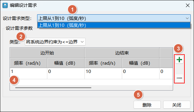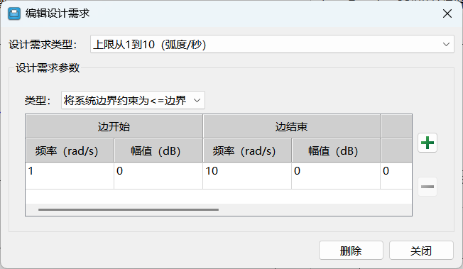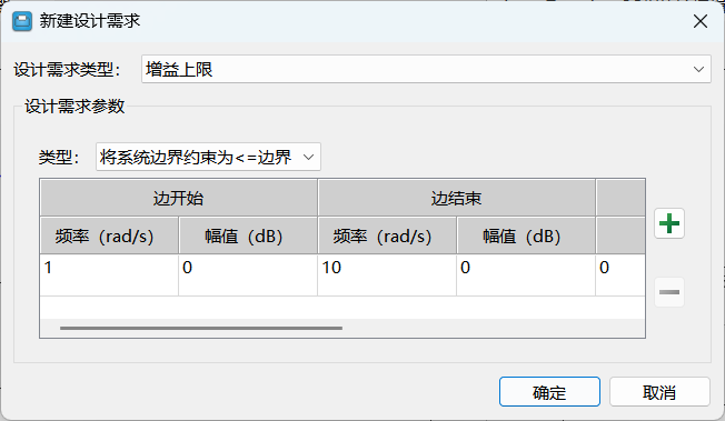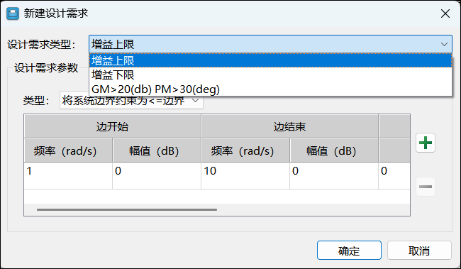 波特图的设计需求中支持指定增益上限、增益下限、增益裕度和相位裕度。