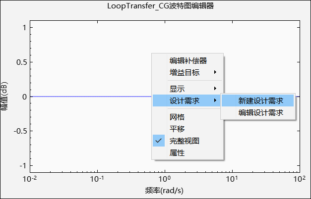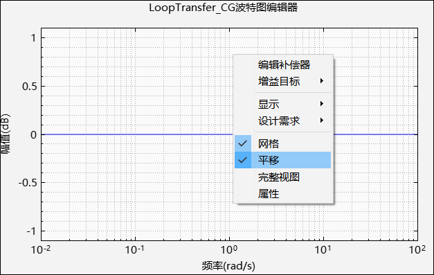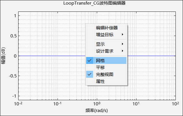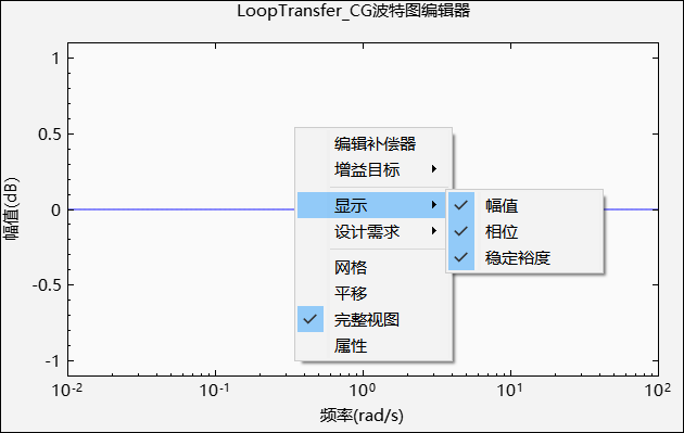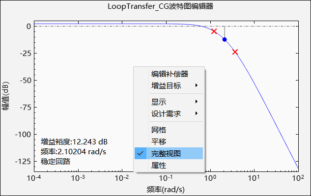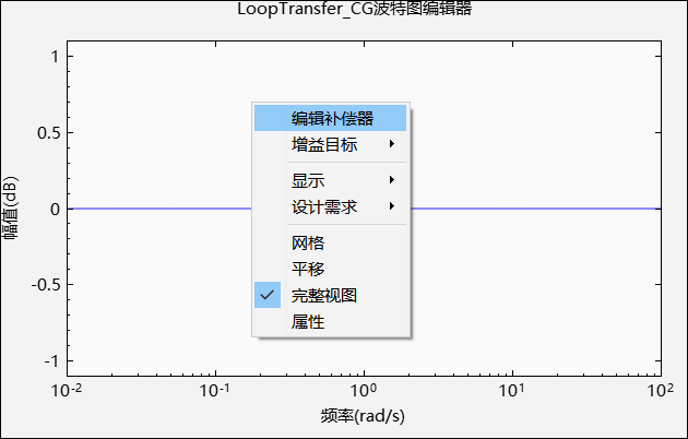 波特图绘图窗口提供了上下文菜单功能,分别为编辑补偿器、增益目标、显示、设计需求、网格、平移、完整视图和属性。