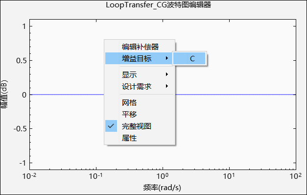 右击增益目标,查看当前响应下能够修改的增益目标。在开环波特图编辑器下,需要调整的增益目标为C。
