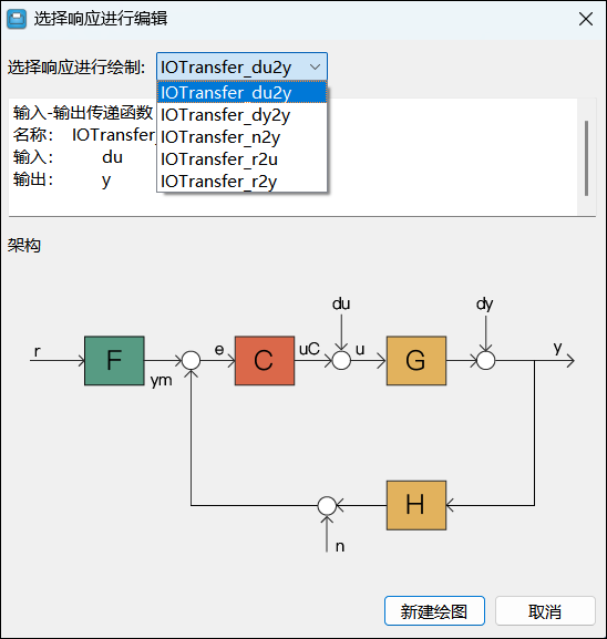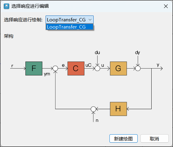 以列表形式展现所选控制系统的架构中包含的控制器和固定模块。 默认的控制系统架构中控制器为 F 和 C,固定模块为 G 和 H。通过上下文菜单可以对控制器的参数进行编辑和绘制响应曲线;固定模块的参数只能查看。