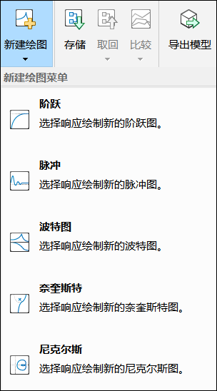 中央绘图窗口默认显示波特图、根轨迹图和阶跃图。如需增加其他类型绘图,单击新建绘图,选择需要的绘图类型和响应类型,单击新建绘图按钮新建绘图。