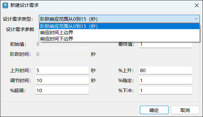 阶跃响应需求支持指定响应时间上边界、响应时间下边界和阶跃响应范围从0到15(秒)。
