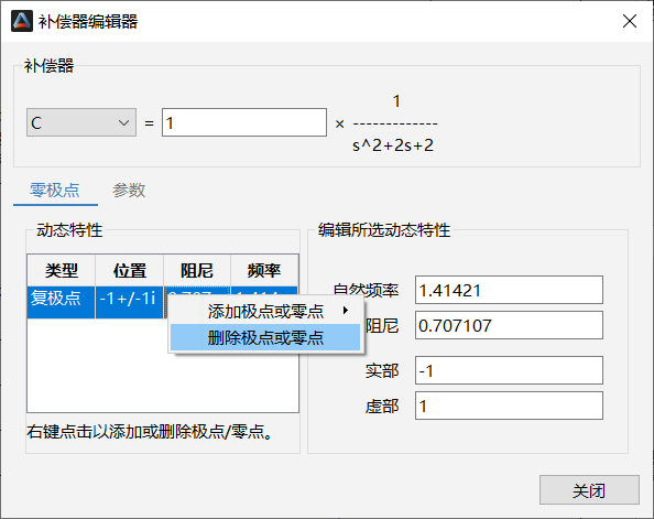 如需在补偿器添加极点和零点,右击空白处以增加或删除极点/零点。当添加零极点时,使用默认参数添加所选类型的极点或零点。