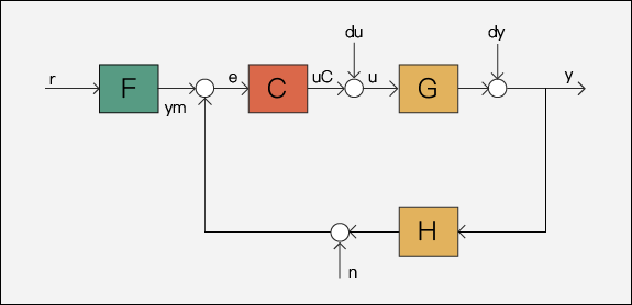 控制系统设计器默认显示一种反馈架构。其中,被控对象模型 G 和补偿器 C 位于前向通道,传感器装置 H 位于反馈通道上。