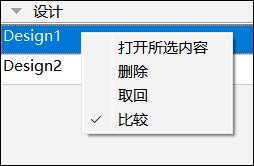 在设计面板中以列表形式展现所有保存的设计。通过上下文菜单可以查看设计详情、删除设计、取回设计和比较多个设计。