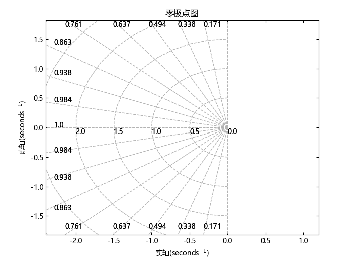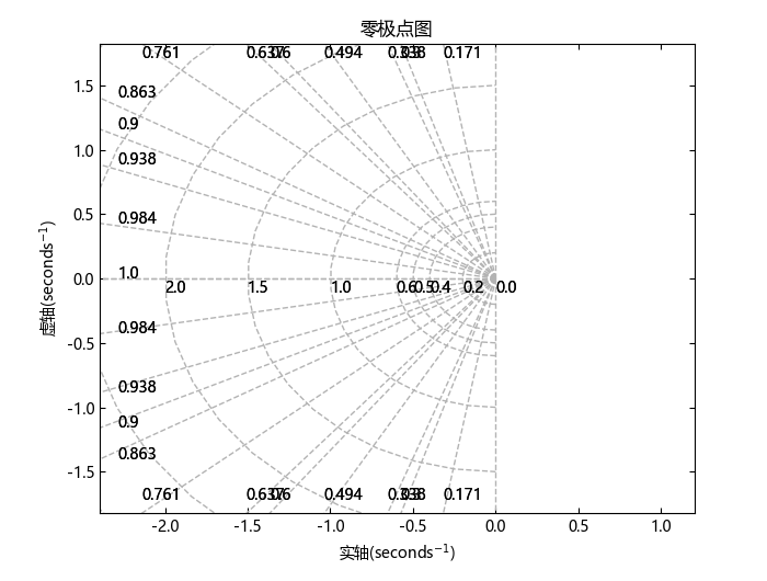 sgrid(zeta, wn) 分别绘制向量 zeta 和 wn 中指定的阻尼因子和固有频率网格。如果当前轴包含一个连续的s平面根轨迹图或零极点图,则此函数在绘图上创建网格。 示例