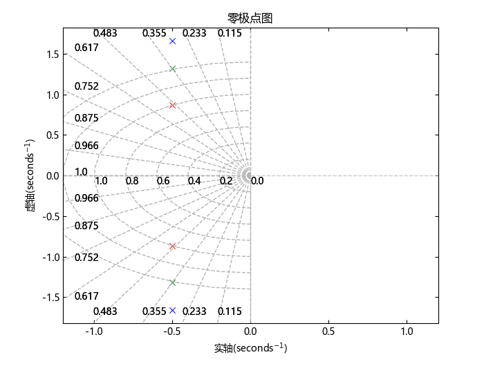 系统的极点,返回为向量,以系统时间单位(目前只支持:秒(seconds))的倒数为单位进行表示,向量元素按幅值降序排列。对于幅值相同的极点,其顺序优先级为:不稳定的极点==不稳定极点的共轭>稳定的极点==稳定极点的共轭。