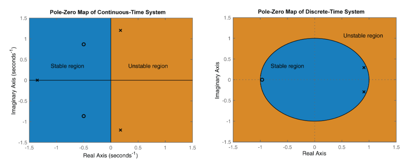 - 在连续时间内,复数 s 平面上的所有极点都必须在左半平面 (蓝色区域) 中,以确保稳定性。如果不同的极点位于虚轴上,即极点的实部为零,则系统是临界稳定的;