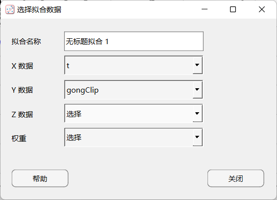 在曲线拟合器中,选择拟合的数据变量。在曲线拟合器选项卡的数据部分,单击选择数据。在选择拟合数据对话框中,选择 t 作为 X 数据值,选择 gongClip 作为 Y 数据值。