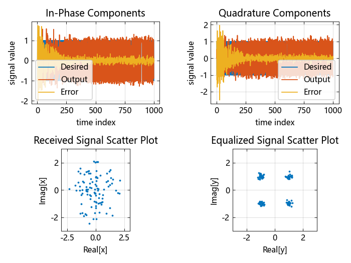 输出信号 y 和所需信号 d 之间的差,以标量或列向量形式返回。 仿射投影滤波器的目标是最小化这个误差。 对象调整其系数以向最佳滤波器系数收敛,从而产生与所需信号密切匹配的输出信号。 要访问仿射投影滤波器系数,请在将输入和所需信号传递给对象后调用 apf.Coefficients 系数。
