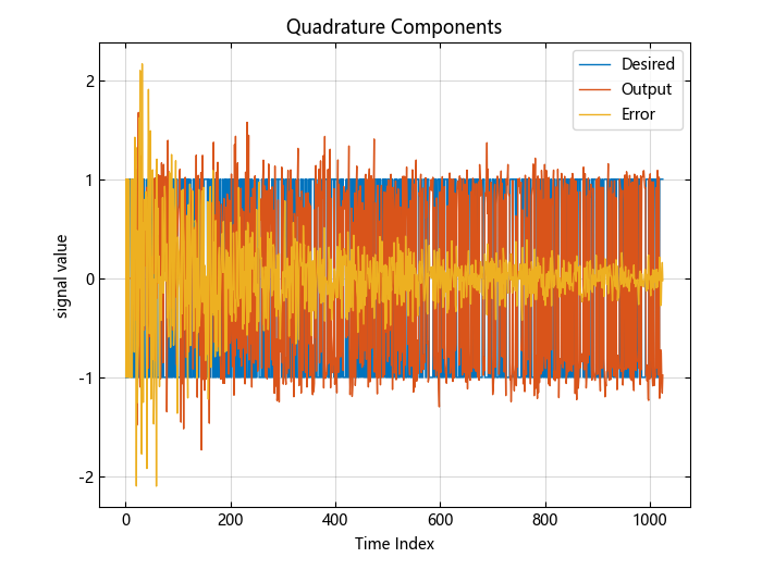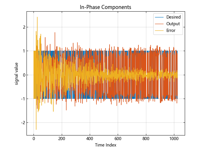 绘制所需信号、输出信号和误差信号的同相和正交分量。