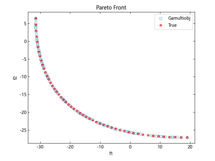 本示例展示如何使用多目标遗传算法创建帕累托前沿的一组点, 并与理论上的精确点进行比较。