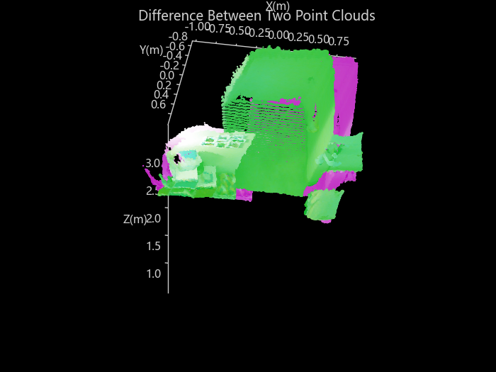 pcshowpair(ptCloudA,ptCloudB) 创建一个可视化图形,展示两个输入点云之间的差异。差异通过将点云 A 用洋红色表示、点云 B 用绿色表示并进行混合来显示。示例