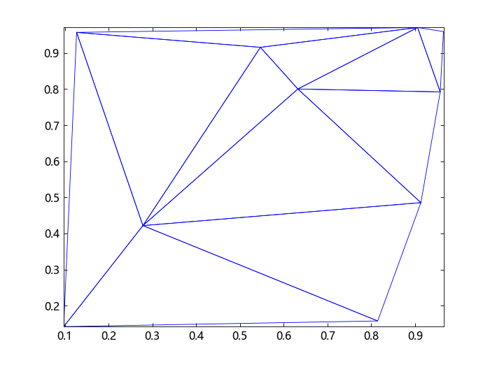 triplot(T,x,y) 绘制由向量 x 和 y 中的点以及三角连接矩阵 T 定义的二维三角剖分。