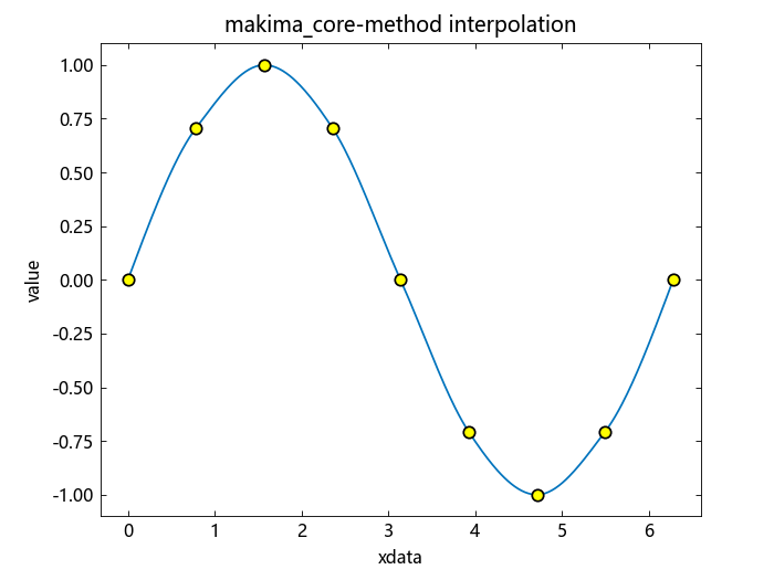 yq = makima_core(x,y,xq) 使用采样点 x 处的值 y 执行修正 Akima 插值,以求出查询点 xq 处的插值 yq。示例