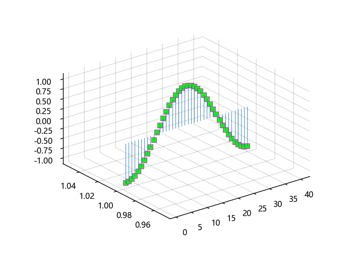 stem3(Z; markerfmt="s", markeredgecolor="#FF00FF", markerfacecolor=[0, 1, 0])