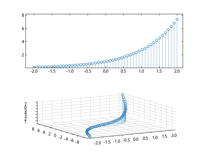 调用 subplot 函数以创建一个 2×1 分块图布局和一个坐标区对象 ax1 和 ax2。通过将坐标区对象指定为 stem3 的第一个参数,在坐标区中创建单独的针状图。