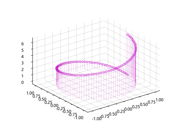 创建一个三维针状图并指定针状线条沿圆的位置。将针状图设置为点线样式,将标记符号设置为星号,以及将颜色设置为品红色。