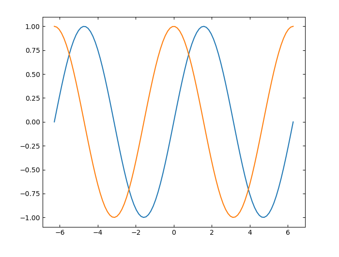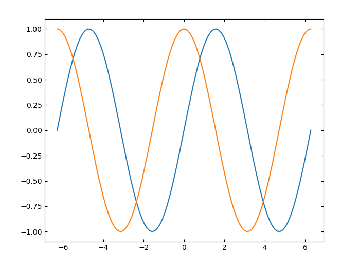 将 x 定义为 100 个介于 −2π 和 2π 之间的线性间隔值。将 y1 和 y2 定义为 x 的正弦和余弦值。创建上述两个数据集的线图。