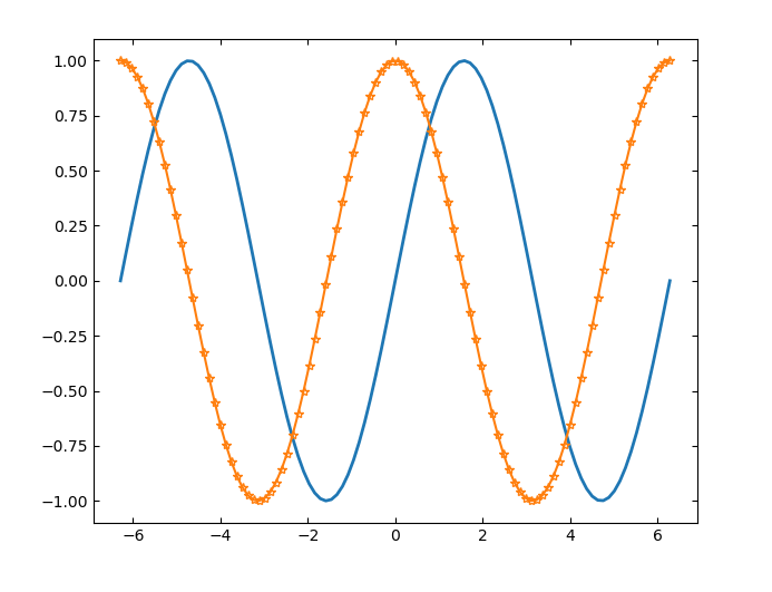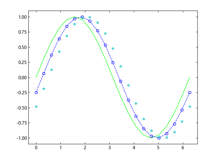 绘制三条正弦曲线,每条曲线之间存在较小的相移。第一条正弦曲线使用绿色线条,不带标记。第二条正弦曲线使用蓝色虚线,带圆形标记。第三条正弦曲线只使用青蓝色星号标记。