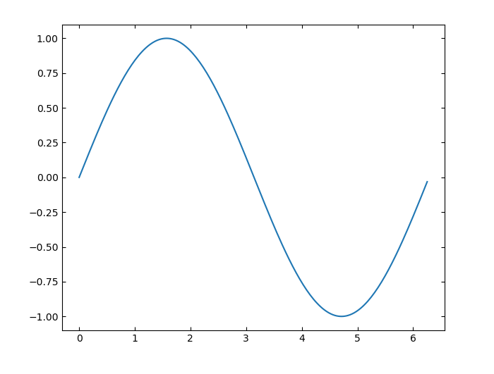 将 x 创建为由 0 和 2π 之间的线性间隔值组成的向量。在各值之间使用递增量 π/100。将 y 创建为 x 的正弦值。创建数据的线图。