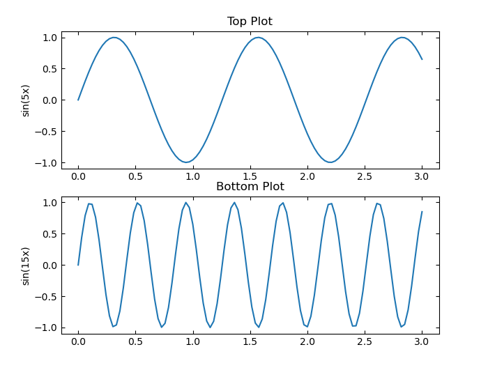 调用 subplot 函数以创建一个 2×1 分块图布局和一个坐标区对象,并将该对象返回为 ax1。通过将 ax1 传递给 plot 函数来创建顶部绘图。通过将坐标区传递给 title 和 ylabel 函数,为图添加标题和 y 轴标签。重复该过程以创建底部绘图。