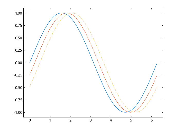 绘制三条正弦曲线,每条曲线之间存在较小的相移。第一条曲线使用默认的线型。为第二条曲线指定虚线样式,第三条曲线指定点式线样式。