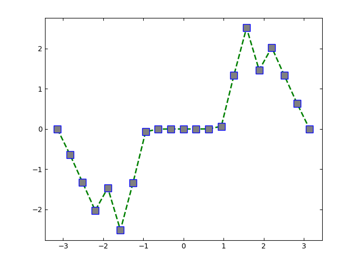 创建线图并使用 fmt 选项指定带正方形标记的绿色虚线。使用 Key=Value 对组来指定线宽、标记大小和标记颜色。将标记边颜色设置为蓝色,并使用 RGB 颜色值设置标记面颜色。