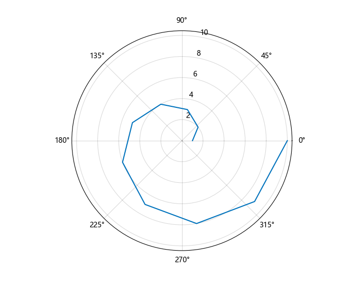 沿 theta 轴的 0 到 360 度之间的非均匀值处显示刻度线。