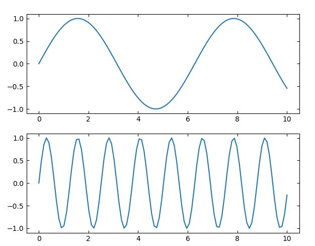 创建带有两个堆叠子图的图窗。在每个子图上绘制一条正弦波。