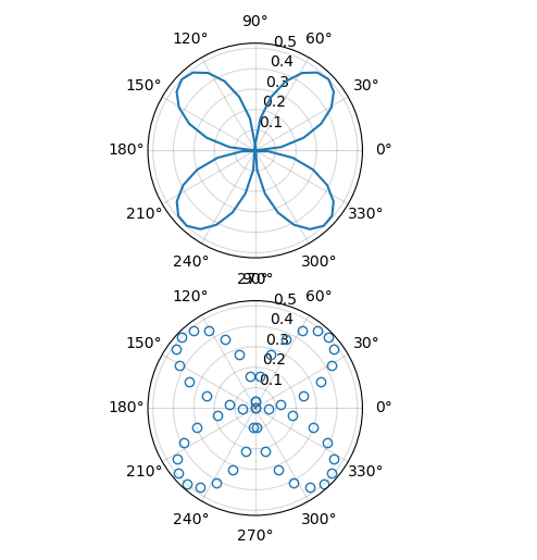 polarplot(ax2, theta, rho, "o"; rlim=(0, 0.5))