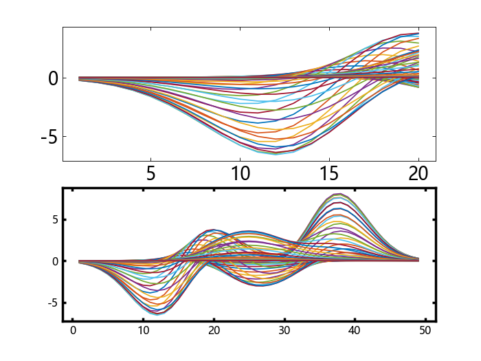 通过设置 Axes 对象的属性来修改坐标区。更改上部子图的字体大小和下部子图的线宽。某些绘图函数可设置坐标区属性。先执行绘图函数,然后指定坐标区属性以免覆盖现有坐标区属性的设置。使用圆点表示法设置属性。