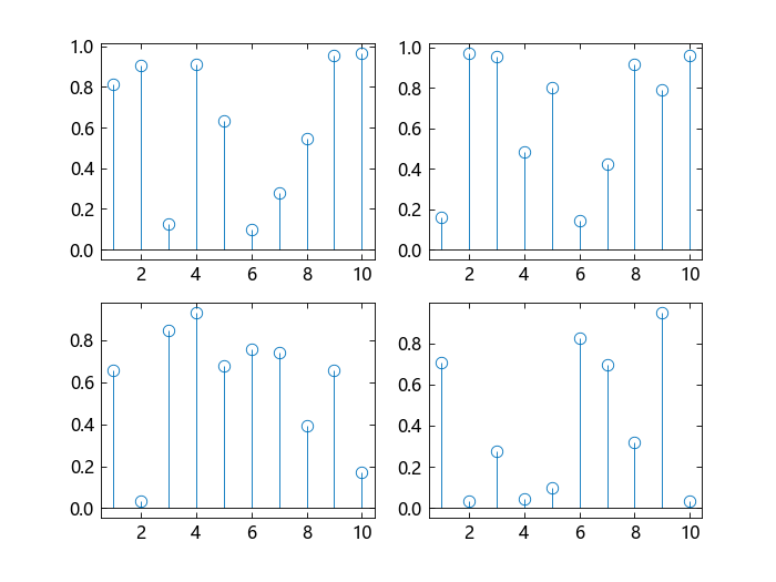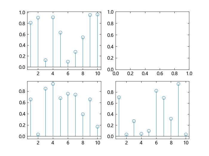 创建一个包含四个随机数据针状图的图窗。然后将第二个子图替换为空坐标区。