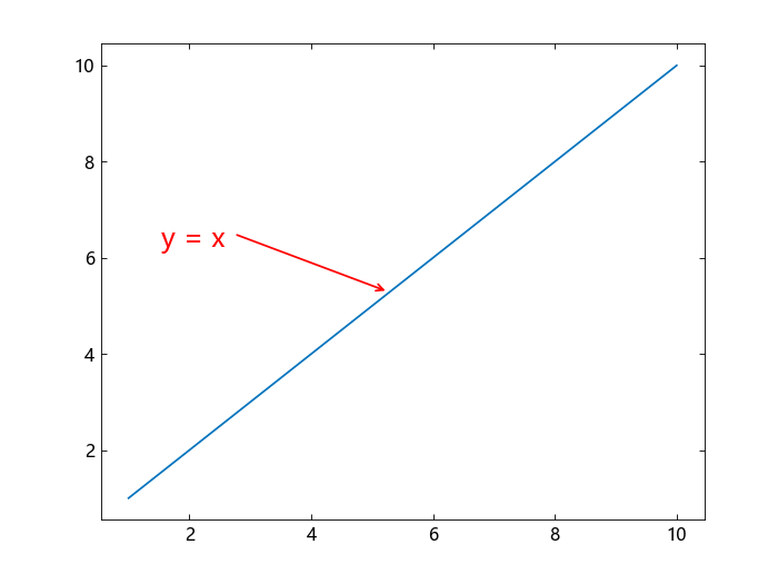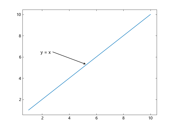 annotation("textarrow", x, y, string ="y = x ")