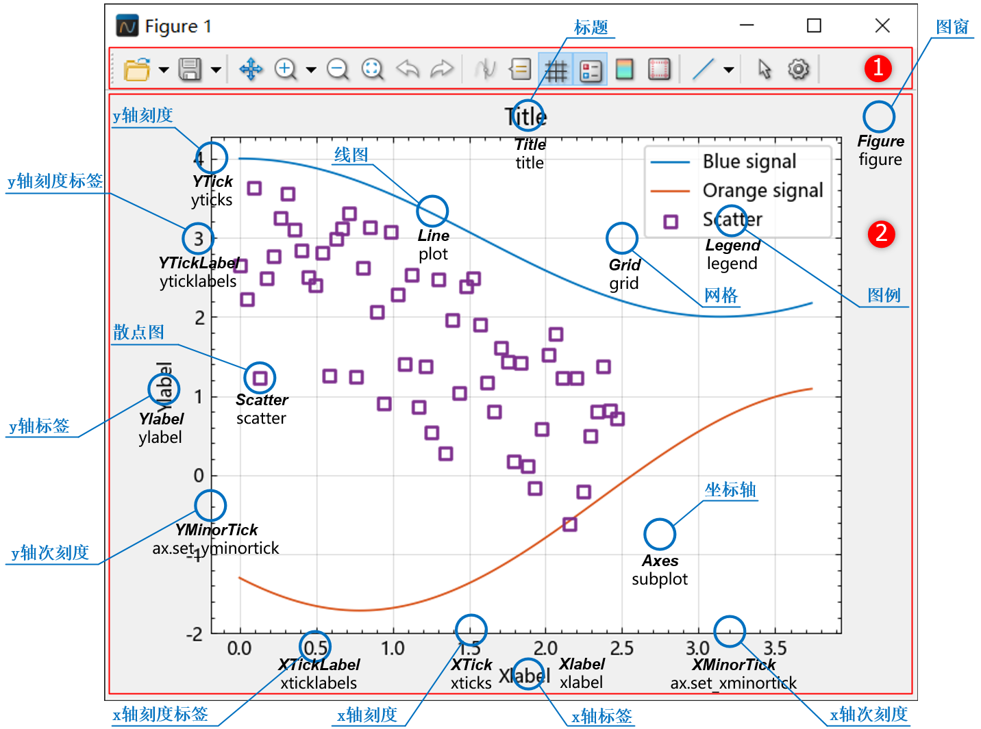 图例 (Legend),解释图中不同数据或图形元素的符号和名称,用于识别和区分各个数据集;