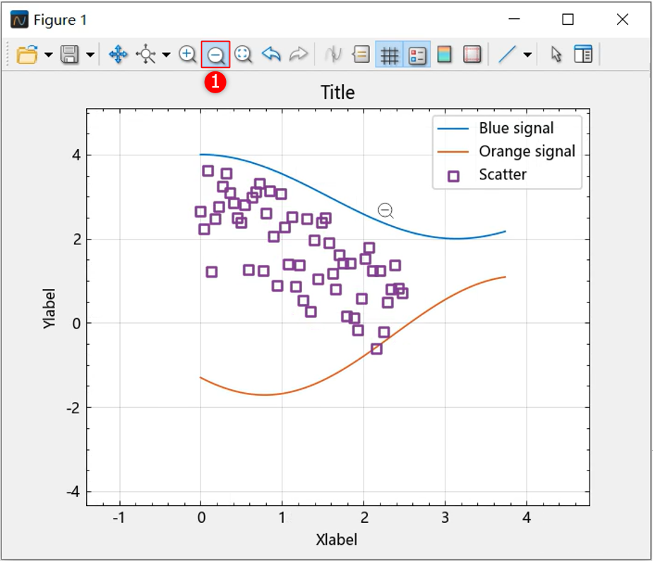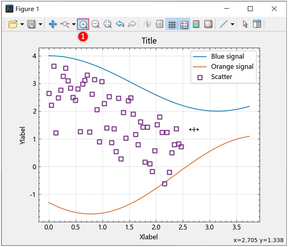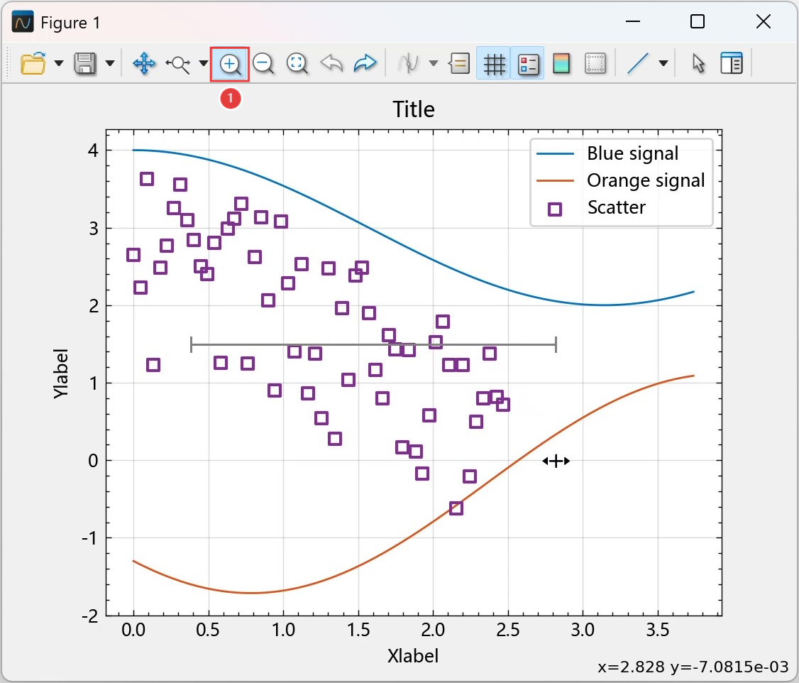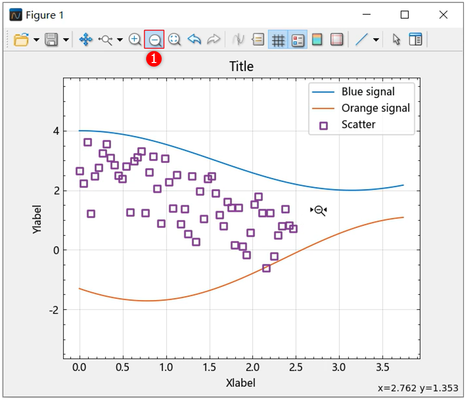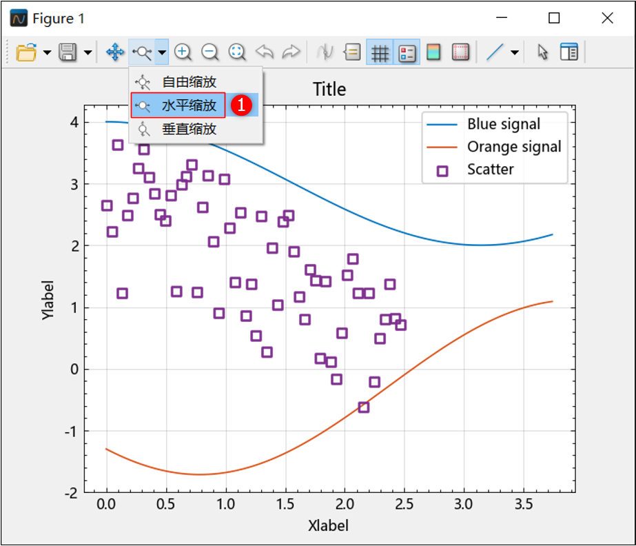选择 ① 处的放大按钮,按住鼠标左键,拖动鼠标形成线段,松开鼠标后仅在 x 轴方向上放大;