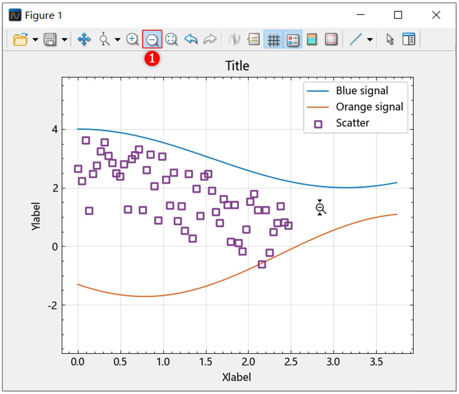 选择 ① 处的放大按钮,按住鼠标左键,拖动鼠标形成线段,松开鼠标后仅在 y 轴方向上放大;