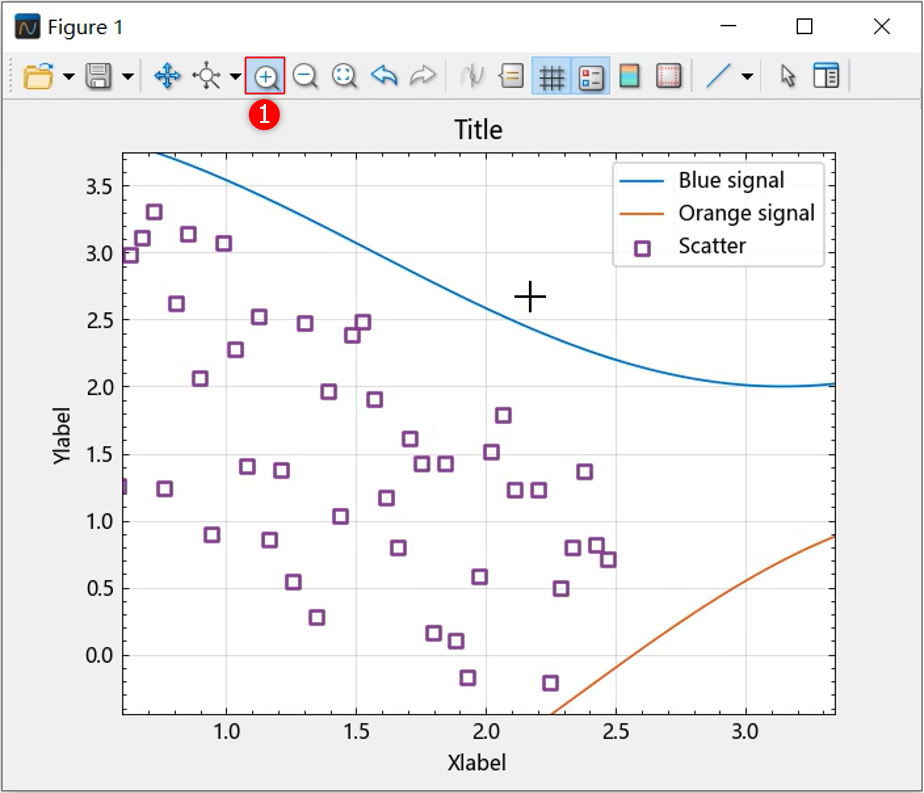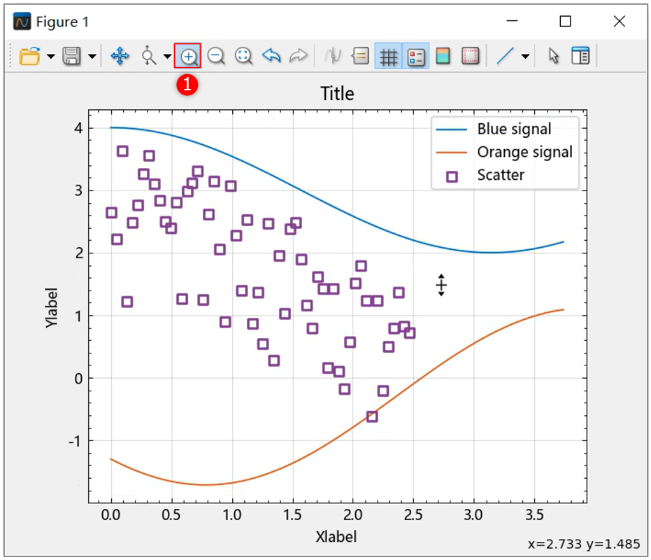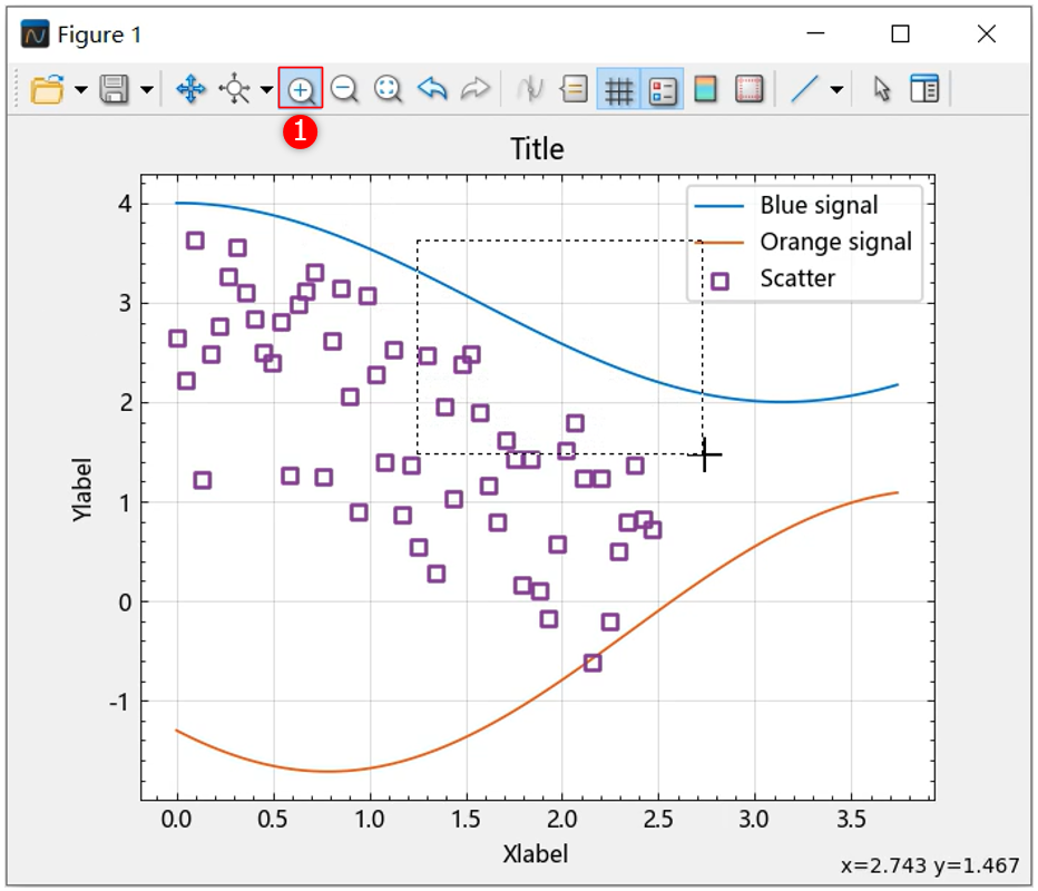选择 ① 处的放大按钮,启用放大功能。然后按住鼠标左键,拖动鼠标划定放大范围: