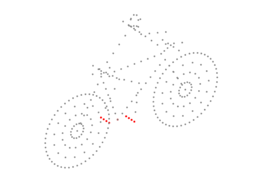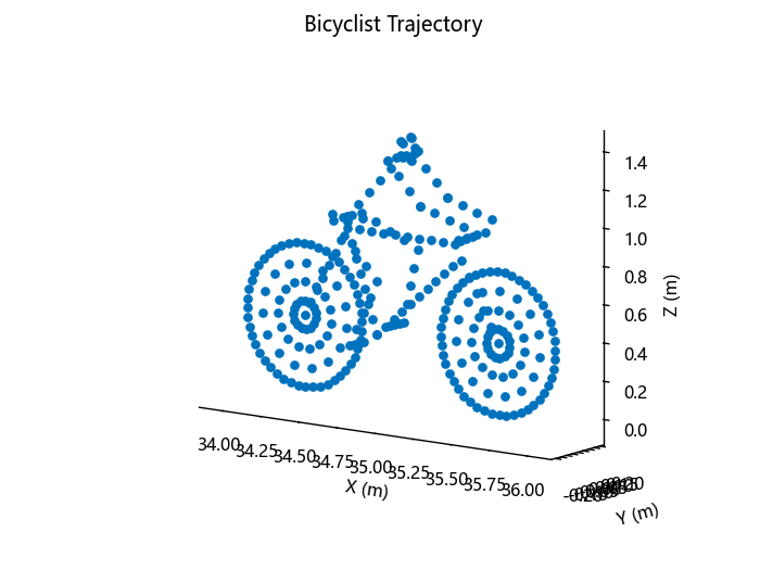 自行车手由五个主要部分组成:自行车车架和骑手、脚踏板、骑手的腿、前轮和后轮。每个组件都包含许多散射体。所有组件的移动速度由指定速度和方向属性决定。此外,腿部、踏板和车轮也会发生由速度决定的周期性运动。