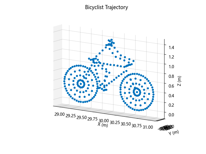 backscatterBicyclist 对象模拟从移动的自行车手身上反射的反向散射雷达信号。自行车手包括自行车和骑手。该对象对自行车手的运动进行建模,并计算来自自行车手身上多个离散散射体的所有反射信号的总和。该模型忽略了自行车内部的遮挡物。反射信号基于 77 GHz 雷达系统开发的多散射体模型。