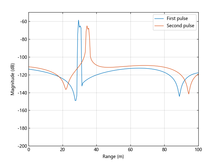 sigtrns2 = step(chan, repeat(sig, 1, N), radarpos, bpos, [0; 0; 0], bvel)