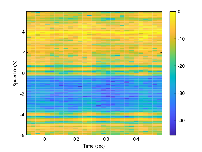 显示一个显示微多普勒效应的声谱图,该效应来源于反射自移动骑自行车目标上散射体的雷达信号。一个静止的雷达发射 1000 个 FMCW 雷达波脉冲,带宽为 250 MHz,持续时间为 1 微秒。雷达工作在 24 GHz 频率。骑自行车者从离雷达 5 米处开始,以 4 米/秒的速度远离雷达。