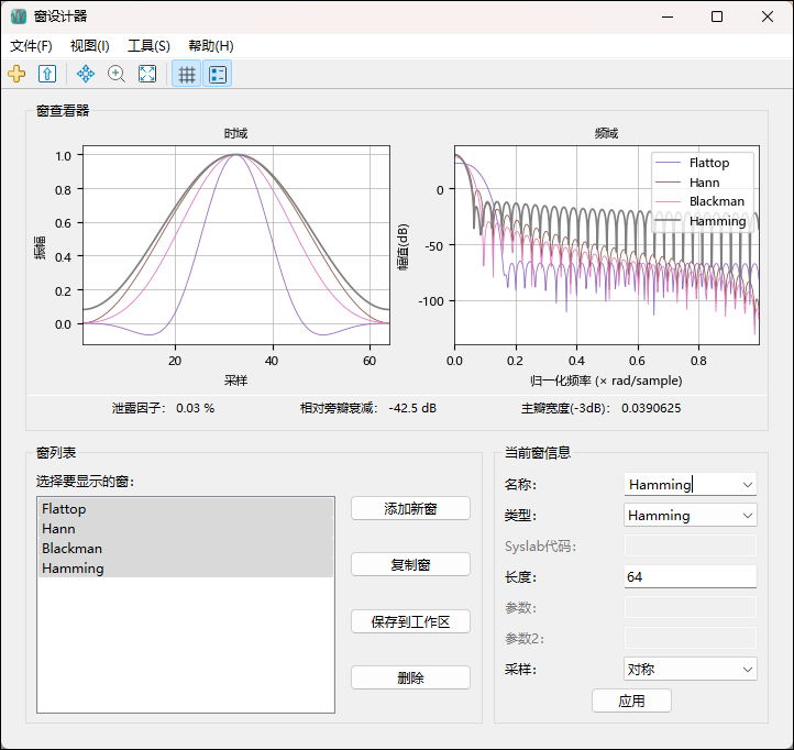 以下窗设计器界面比较了 Blackman 窗、Hamming 窗、Hann 窗和平顶窗: