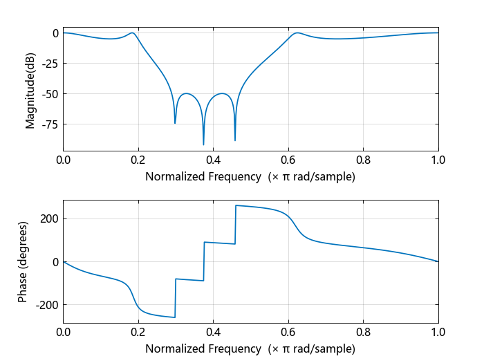 b, a = ellip(3, 5, 50, [0.2 0.6], "bandstop")