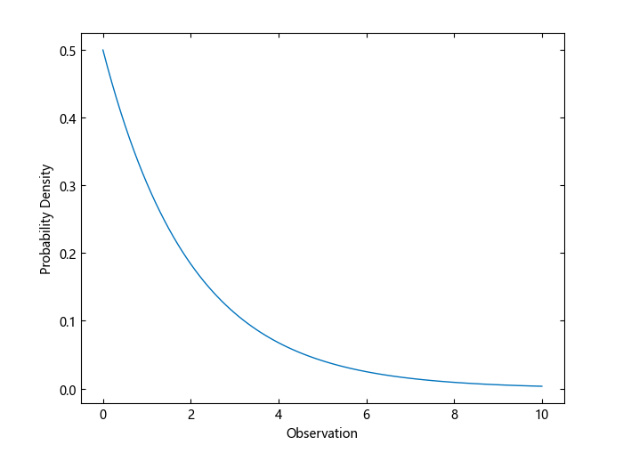 通过指定参数值 (Exponential) 创建概率分布对象 ExponentialDistribution。 然后,使用对象函数来评估分布、生成随机数等。
