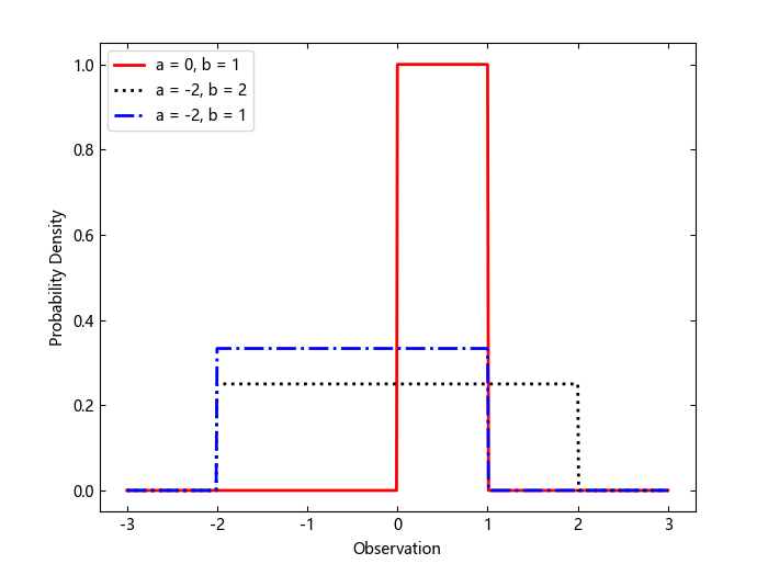 创建三个具有不同参数的均匀分布对象。