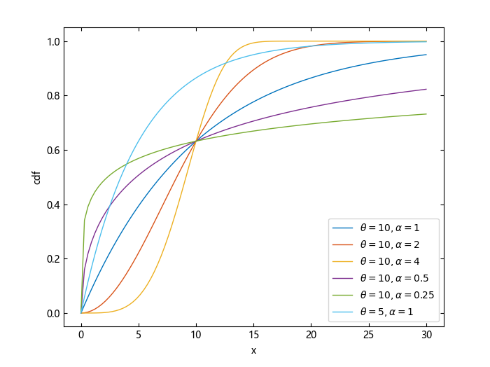Weibull 分布的累积分布函数 (cdf) 为